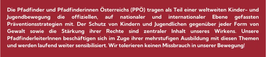 Die „Kinder- und Jugendschutzrichtlinie der Pfadfinder und Pfadfinderinnen Österreichs“ (KJSR der PPÖ) und die dazugehörige „Resolution zum Kinder- und Jugendschutz bei den Pfadfindern und Pfadfinderinnen Österreichs“ (Resolution KJS) stellt unser Selbstverständnis zu diesen Themen dar. Sie fassen jene Grundlagen zusammen, wie wir den Schutz und die Rechte der uns anvertrauten Kinder und Jugendlichen bewusst, proaktiv und einheitlich sicherstellen und befolgen wollen.